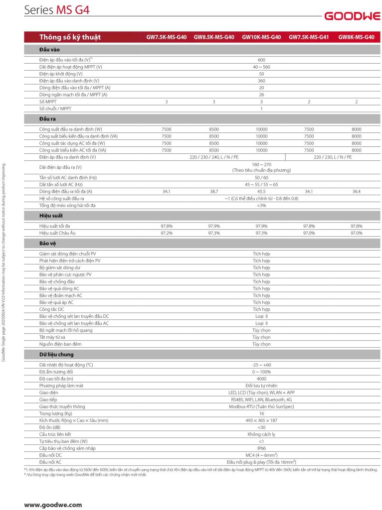 GoodWe GW8K-MS-G40 là biến tần hòa lưới 1 pha công suất 8kW, thuộc Series MS G4 (7.5–10kW | Một pha | 2/3 MPPT). Là thế hệ thứ tư của dòng biến tần dân dụng một pha đã được kiểm chứng, MS G4 được nâng cấp về hiệu suất, độ tin cậy, tính năng và an toàn, mang đến giải pháp điện mặt trời mạnh mẽ và linh hoạt hơn cho hệ thống dân dụng.