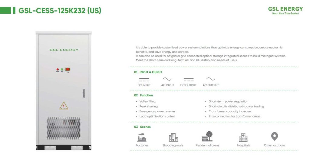 GSL-CESS-125K232 là hệ thống lưu trữ năng lượng thương mại và công nghiệp (C&I) dung lượng cao, làm mát bằng chất lỏng, kết hợp công nghệ pin lithium sắt photphat (LiFePO₄) tiên tiến với hệ thống quản lý pin thông minh (BMS) và bộ biến tần tích hợp. Được thiết kế để tối ưu hóa việc sử dụng điện năng, giảm chi phí vận hành và hỗ trợ cả các kịch bản kết nối lưới điện và độc lập, hệ thống này lý tưởng cho việc giảm tải đỉnh điểm, dự phòng khẩn cấp và tích hợp năng lượng tái tạo. Thiết kế tủ tích hợp đảm bảo triển khai nhanh chóng, tuổi thọ cao và hiệu suất đáng tin cậy ngay cả trong những môi trường khắc nghiệt nhất.