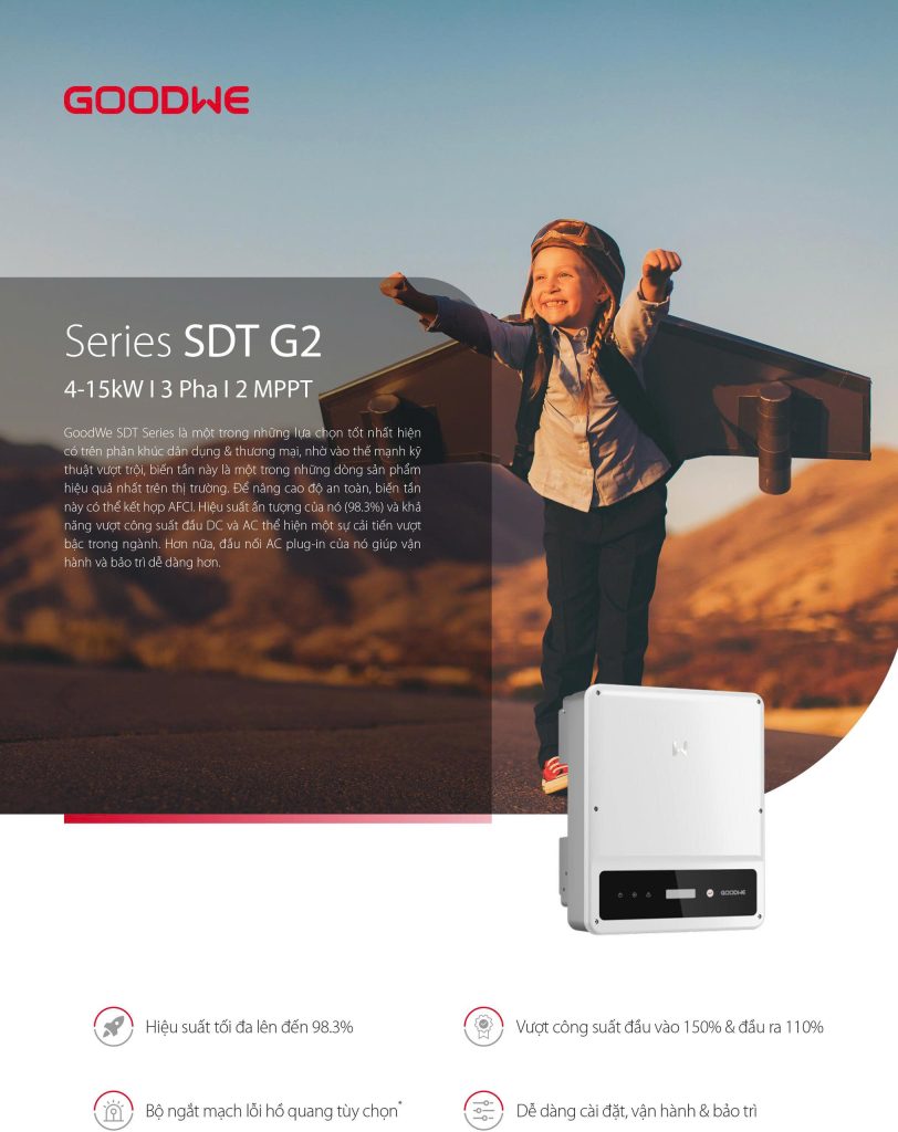 GoodWe GW15KT-DT là biến tần hòa lưới 3 pha công suất 15kW, thuộc Series SDT G2 (4–15kW | 3 Pha | 2 MPPT). Dòng SDT G2 phù hợp cho dân dụng & thương mại, nổi bật nhờ hiệu suất cao, vận hành ổn định và hỗ trợ AFCI tùy chọn để tăng cường an toàn cho hệ thống.