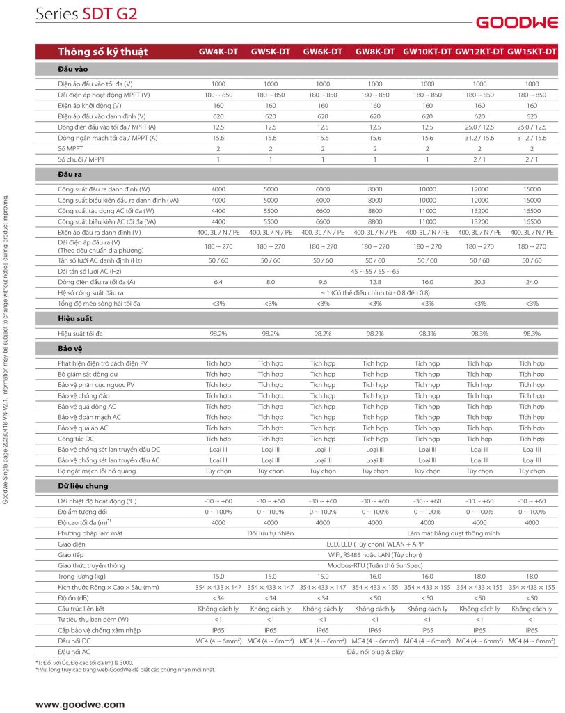 - Hiệu suất tối đa (GW15KT-DT): 98.3%.