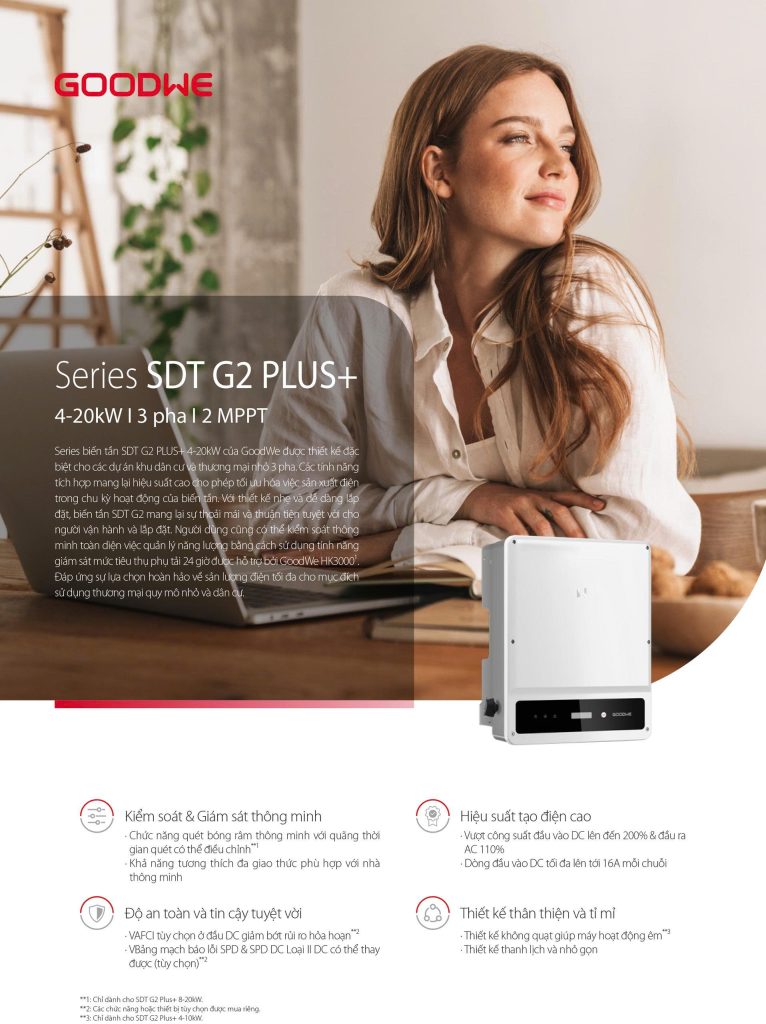 GoodWe GW20K-SDT-20 là biến tần hòa lưới 3 pha công suất 20kW, thuộc Series SDT G2 PLUS+ (4–20kW | 3 pha | 2 MPPT). Đây là model công suất lớn nhất của dòng SDT G2 PLUS+, phù hợp cho nhà xưởng, thương mại và hệ thống điện mặt trời quy mô vừa, yêu cầu hiệu suất cao và độ ổn định lâu dài. Thiết bị hỗ trợ VAFCI (tùy chọn) và giám sát phụ tải 24 giờ khi kết hợp thiết bị phù hợp (GoodWe HK3000).