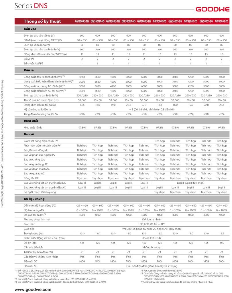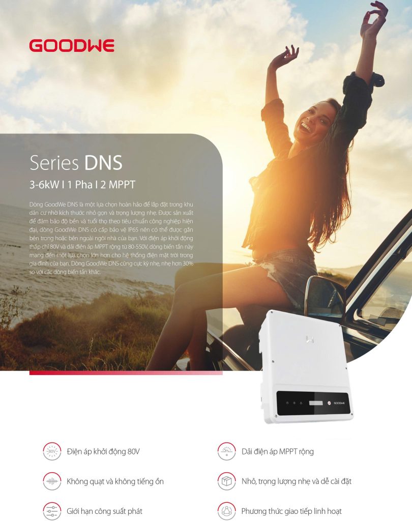GoodWe GW6000T-DS là biến tần hòa lưới 1 pha công suất 6kW, thuộc Series DNS (3–6kW | 1 Pha | 2 MPPT). Dòng DNS hướng đến lắp đặt dân cư với thiết kế nhỏ gọn, vận hành đối lưu tự nhiên (không quạt), hỗ trợ giới hạn công suất phát lên lưới, đồng thời có dải MPPT rộng và điện áp khởi động 80V để tối ưu hiệu suất trong nhiều điều kiện mái nhà.