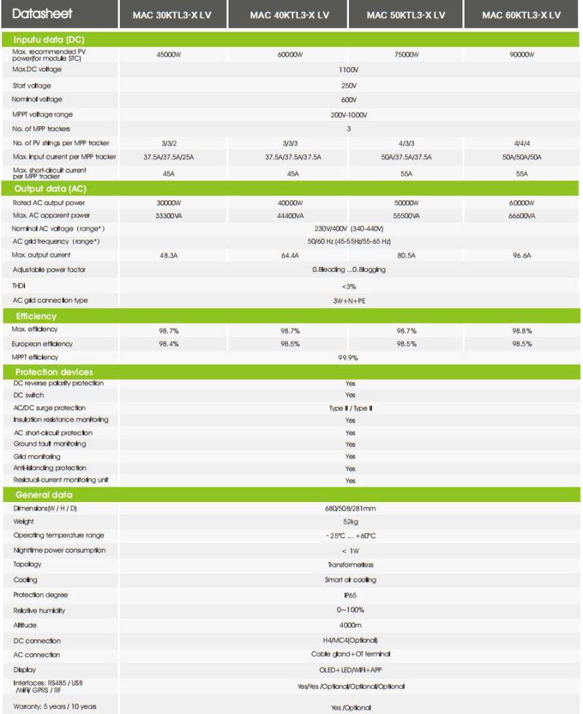 Thông số kỹ thuật INVERTER HÒA LƯỚI GROWATT 50 KW 3 PHA (MAC 50KTL3-X LV)