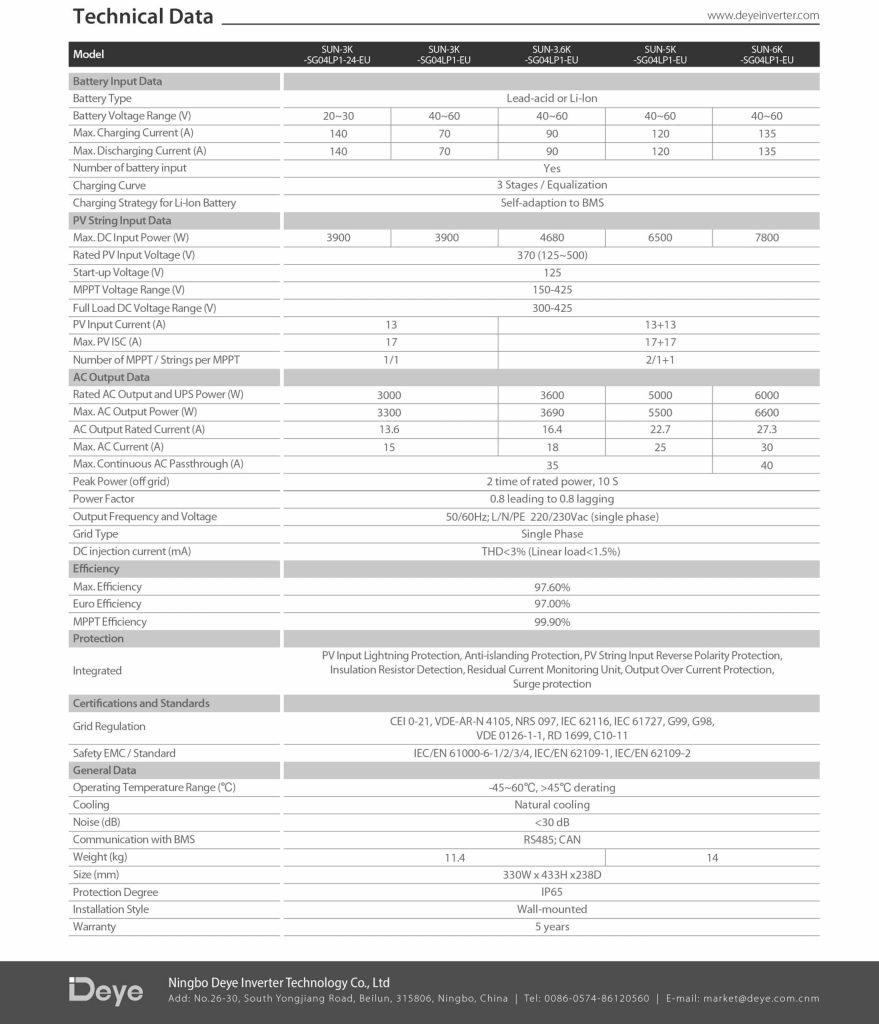 Thông số kỹ thuật của Inverter hybrid hòa lưới, lưu trữ Deye 6KW 1pha (SUN-6K-SG05LP1-EU)