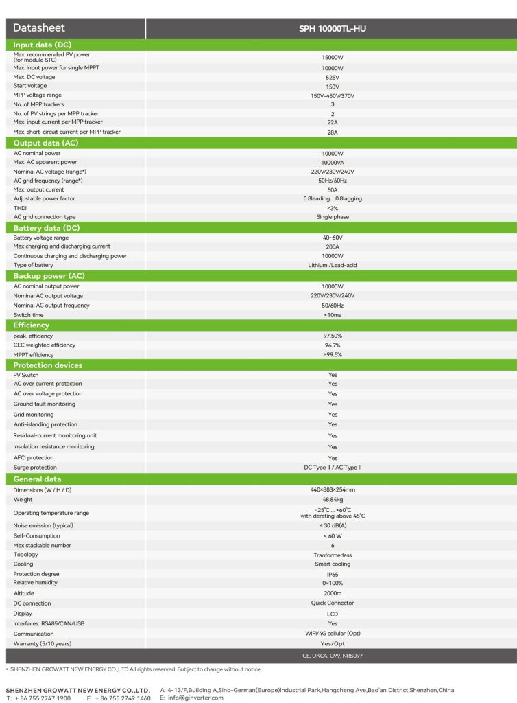 - Tích Hợp Khả Năng Lưu Trữ: Inverter Hybrid Growatt 10kW 1 pha có khả năng kết nối với các hệ thống pin lưu trữ, giúp lưu trữ năng lượng mặt trời vào ban ngày và sử dụng vào ban đêm hoặc khi mất điện.