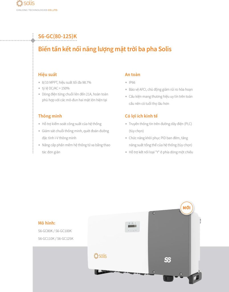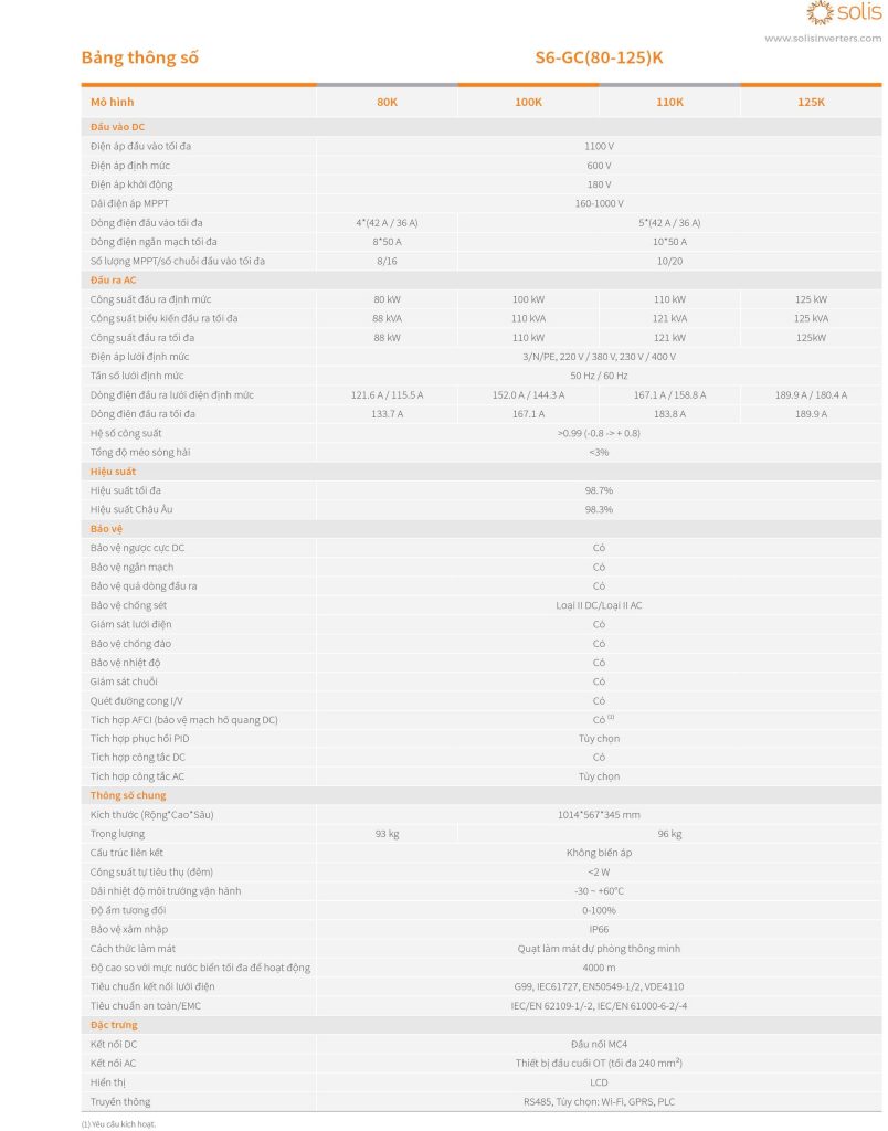 Biến tần chuỗi ba pha 5G 100kW điều chỉnh giảm dần 10 MPPT để cung cấp sơ đồ cấu hình linh hoạt hơn với tốc độ tác động môi trường nhỏ hơn và hiệu suất tạo cao hơn. Tối đa 13A mỗi chuỗi, khả năng nạp chồng 150% DC function Chức năng quét IV thông minh từ xa & cục bộ.