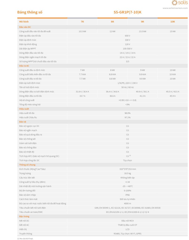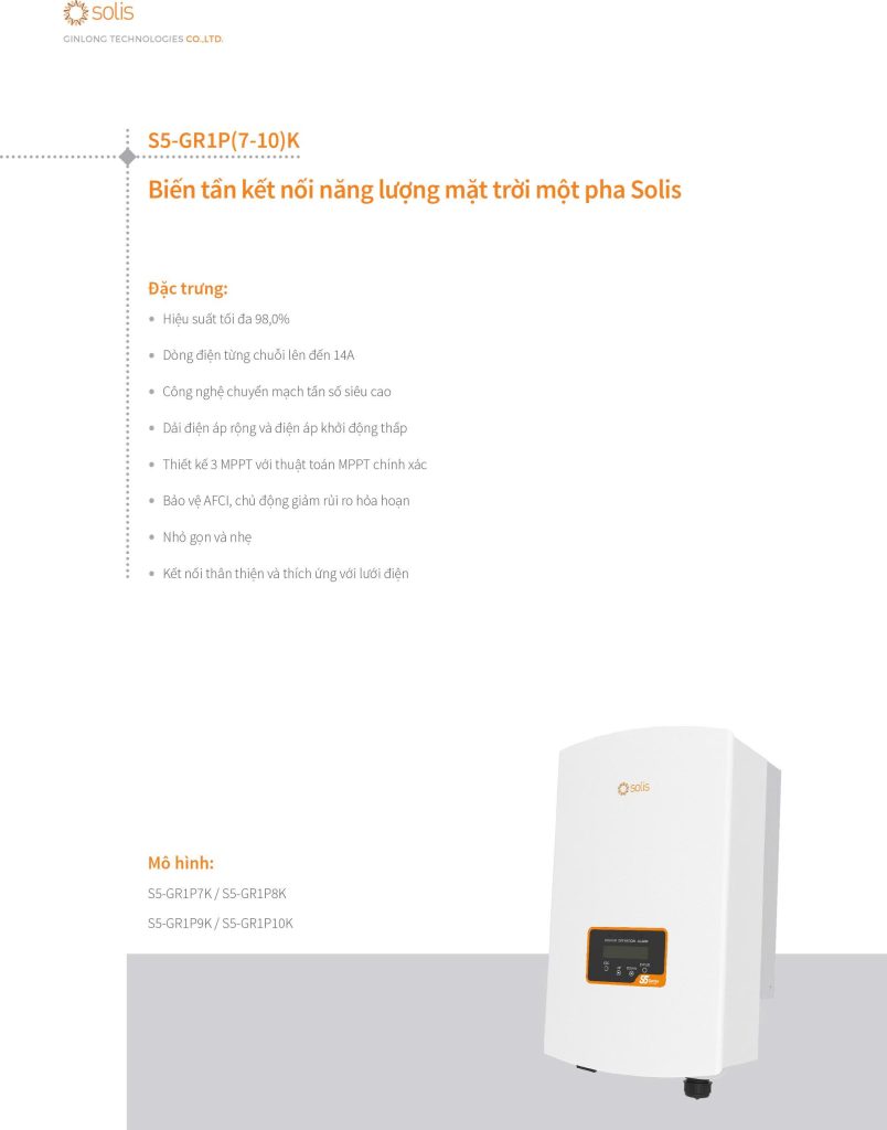 Biến tần S5-GR1P 10K được thiết kế cho các nhà máy điện mặt trời (PV) dân dụng. Thiết kế 3 MPPT có thể làm giảm sự không khớp của chuỗi một các hiệu quả. Thiết kế nhỏ gọn và nhẹ, dễ dàng lắp đặt. Mức bảo vệ được tăng đến IP66. Chức năng AFCI tích hợp có thể chủ động giảm nguy cơ hỏa hoạn.