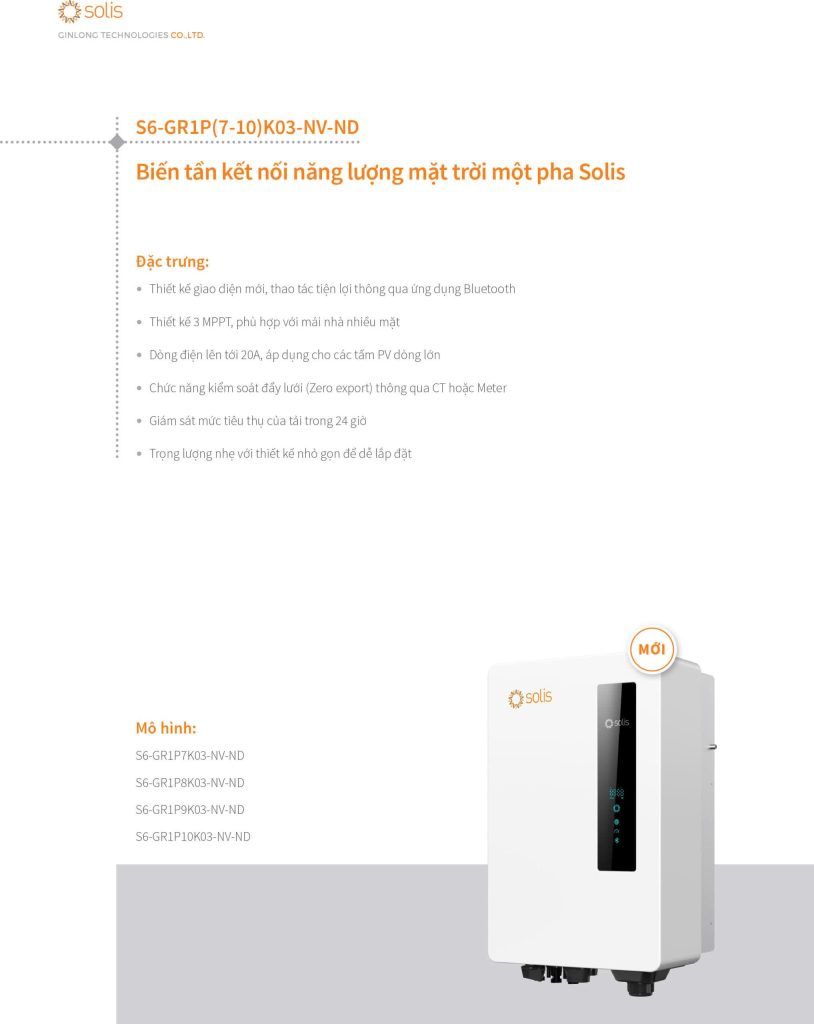 Biến tần dòng S6-GR1P(7-10)K03-NV-ND được thiết kế cho các nhà máy quang điện dân dụng. Với 3 MPPT và dòng điện lên đến 20A, tương thích với tất cả các mô-đun PV công suất cao 182/210mm, phù hợp với nhiều định hướng dân cư phức tạp, tối đa hóa năng suất của nhà máy PV. Thiết kế nhỏ gọn và nhẹ cho phép lắp đặt dễ dàng. Với khả năng kiểm soát xuất bằng 0 và chức năng giám sát tải 24 giờ, hệ thống sẽ giúp nhà máy điện của bạn trở nên thông minh và có thể kiểm soát được. Ngoài ra, hệ thống cũng tích hợp nhiều tính năng an toàn, đảm bảo nhà máy PV của bạn cực kỳ an toàn và đáng tin cậy. Yên tâm tận hưởng nguồn điện xanh.
