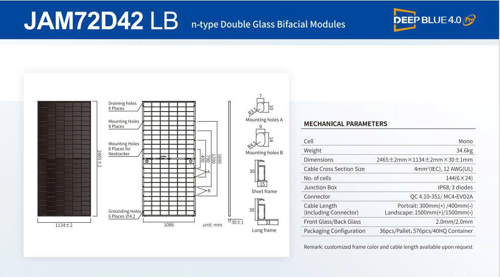 Tấm pin JA Solar 650W thuộc dòng DeepBlue 4.0 Pro là bước tiến mới nhất trong ngành năng lượng tái tạo. Sử dụng công nghệ tế bào quang điện n-type Bycium+ tiên tiến, mang lại hiệu suất phát điện vượt trội và độ bền lâu dài. Sản phẩm được thiết kế tối ưu cho các hệ thống điện mặt trời áp mái công suất lớn, nhà xưởng, trang trại điện mặt trời và các dự án thương mại – công nghiệp.