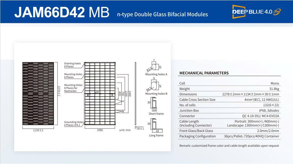 JA Solar 605W JAM66D42 MB là bước đột phá trong dòng Deep Blue 4.0 Pro, được thiết kế để định nghĩa lại tiêu chuẩn về hiệu suất và độ bền trong ngành năng lượng. Nhờ sự kết hợp hoàn hảo giữa công nghệ N-Type thế hệ mới và cấu trúc 2 mặt kính (Bifacial), sản phẩm không chỉ tối ưu hóa lượng điện tạo ra mà còn thách thức mọi giới hạn về thời gian vận hành.