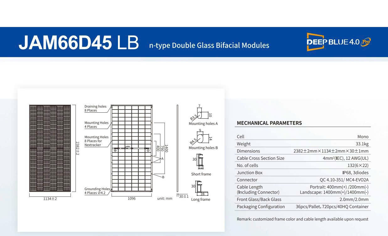 Về mặt công nghệ, tấm pin sử dụng cell Mono n-type Bycium+, kết hợp MBB half-cell và công nghệ DeepBlue 4.0 Pro độc quyền của JA Solar. Cấu trúc này giúp giảm suy hao do tái hợp điện tử, cải thiện hiệu suất trong điều kiện bức xạ thấp và nâng cao khả năng hoạt động ở môi trường nhiệt độ cao. Bên cạnh đó, thiết kế kính đôi giúp tấm pin đạt độ bền cơ học cao, chịu tải gió và tuyết tốt, phù hợp với các điều kiện lắp đặt khắc nghiệt.