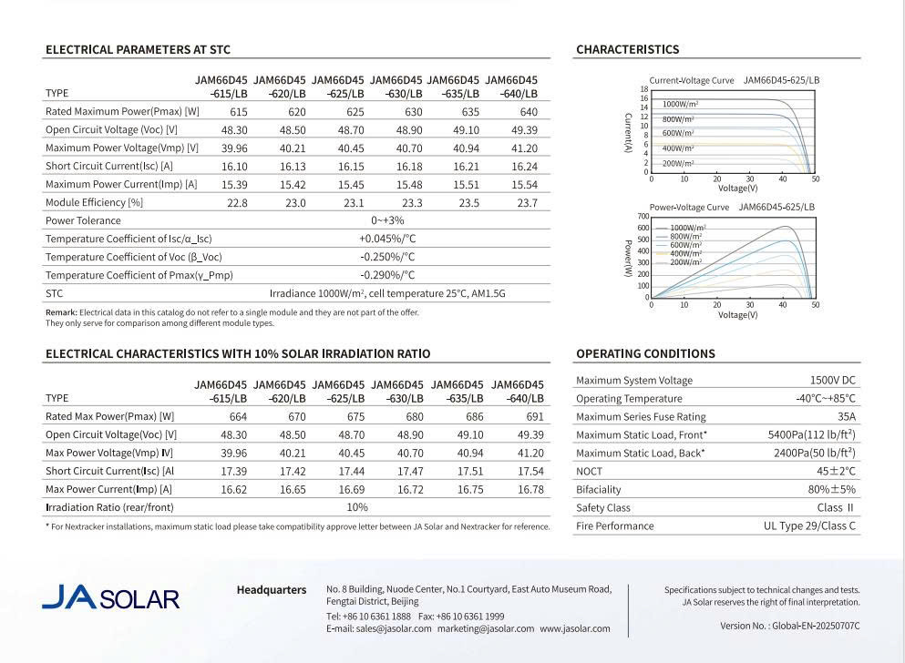 Xét về độ bền và độ tin cậy, JA SOLAR 640W – JAM66D45 LB được trang bị bảo hành sản phẩm dài hạn cùng bảo hành hiệu suất tuyến tính, đảm bảo mức suy giảm công suất thấp theo thời gian. Sản phẩm đáp ứng đầy đủ các tiêu chuẩn quốc tế nghiêm ngặt như IEC, TÜV, CE, mang lại sự an tâm trong quá trình vận hành lâu dài của hệ thống điện mặt trời.