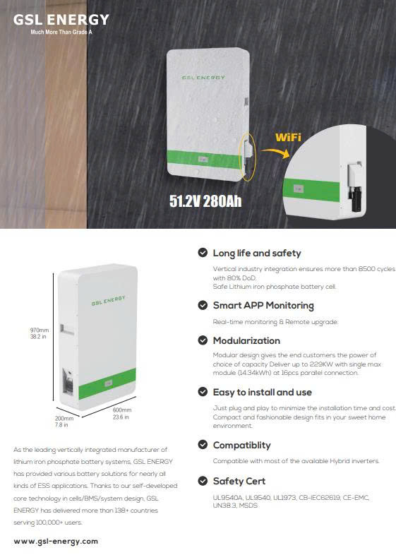 Hệ thống lưu trữ năng lượng GSL Power là một loại pin tích trữ năng lượng, phát hiện sự cố mất điện và tự động trở thành nguồn năng lượng cho ngôi nhà của bạn khi lưới điện bị sự cố. Hệ thống sẽ phát hiện sự cố mất điện, cung cấp năng lượng dự phòng cho nhà bạn và xe điện, đồng thời tự động sạc lại bằng năng lượng mặt trời để các thiết bị của bạn hoạt động trong nhiều ngày. Kết hợp với hệ thống năng lượng mặt trời và sạc lại bằng năng lượng mặt trời để các thiết bị của bạn hoạt động trong nhiều ngày. Hệ thống lưu trữ năng lượng Power giúp giảm sự phụ thuộc vào lưới điện bằng cách lưu trữ năng lượng mặt trời để sử dụng khi không có nắng. Sử dụng hệ thống lưu trữ năng lượng Power một mình hoặc kết hợp với các sản phẩm khác của GSL để tiết kiệm tiền, giảm lượng khí thải carbon và chuẩn bị cho ngôi nhà của bạn trong trường hợp mất điện.
