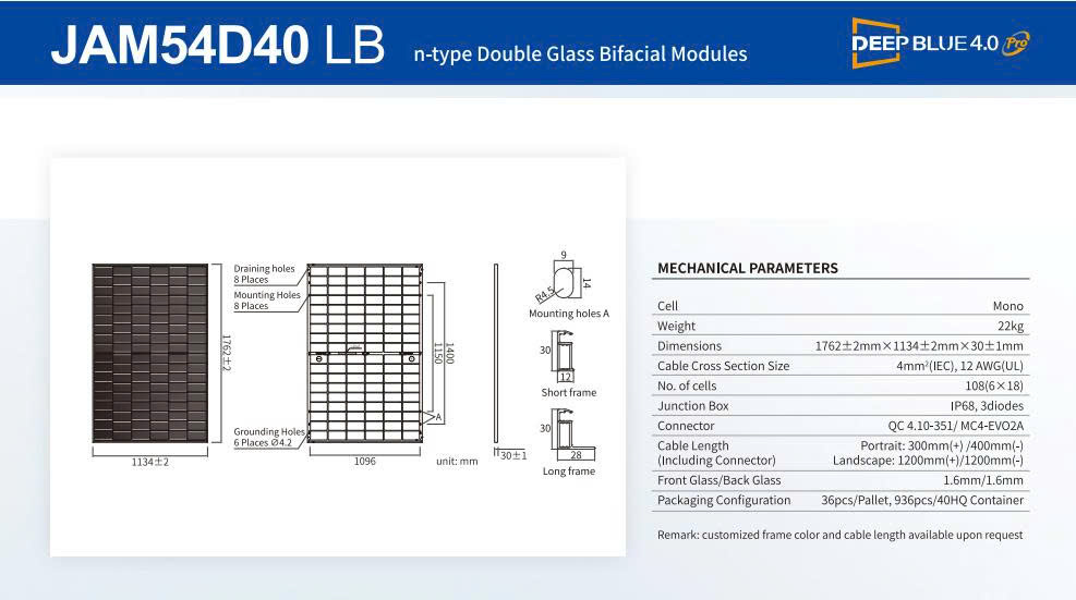 Tấm pin năng lượng mặt trời JA Solar 460W (JAM54D40 LB) là dòng sản phẩm thế hệ mới thuộc series DeepBlue 4.0 Pro. Sản phẩm sử dụng công nghệ n-type kết hợp với thiết kế kính kép (Double Glass) và khả năng phát điện 2 mặt (Bifacial), mang lại hiệu suất vượt trội và độ bền cực cao trong mọi điều kiện môi trường