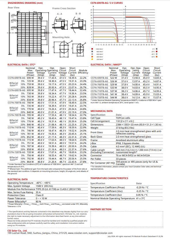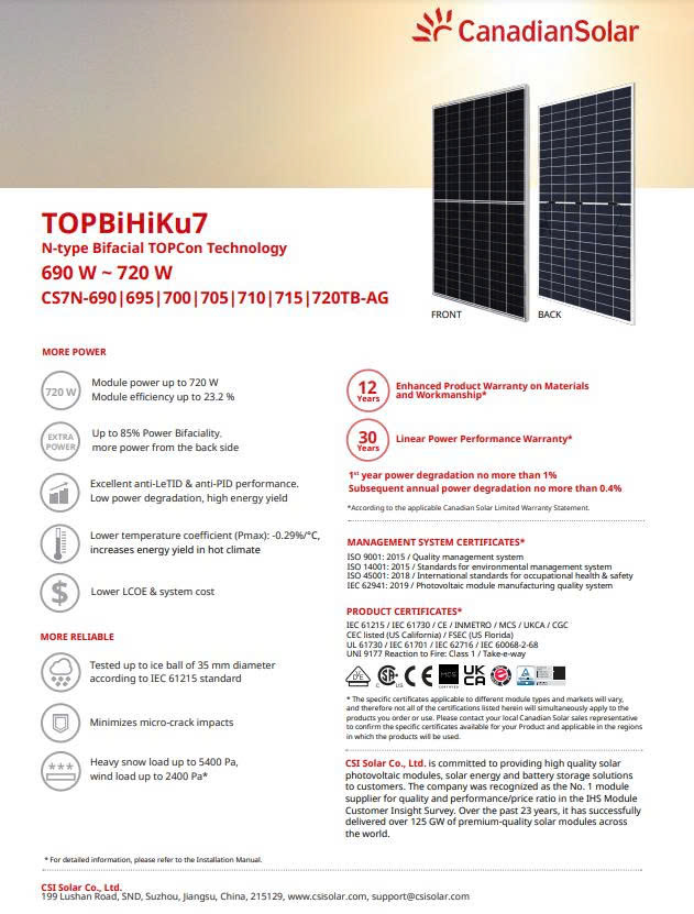 Tấm pin năng lượng mặt trời Canadian Solar 705W thuộc dòng TOPBiHiKu7 là sản phẩm công suất cao, ứng dụng công nghệ tiên tiến N-type bifacial TOPCon, được thiết kế chuyên biệt cho các dự án điện mặt trời quy mô lớn. Với hiệu suất vượt trội, độ bền cao và khả năng tạo điện hai mặt, Canadian Solar 705W mang đến giải pháp tối ưu chi phí đầu tư, gia tăng sản lượng và đảm bảo hiệu quả vận hành dài hạn cho các hệ thống điện mặt trời mặt đất và công nghiệp.