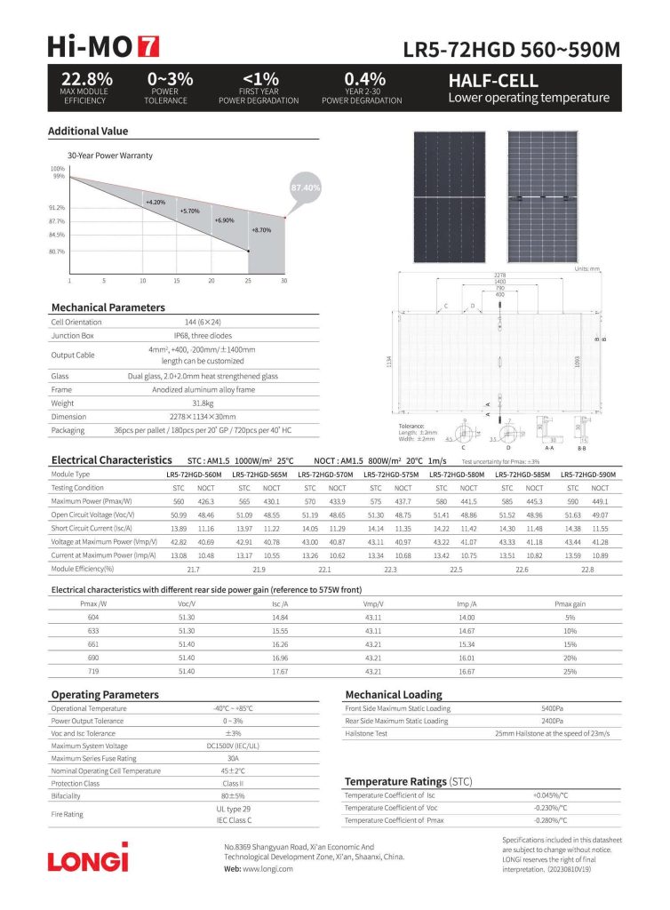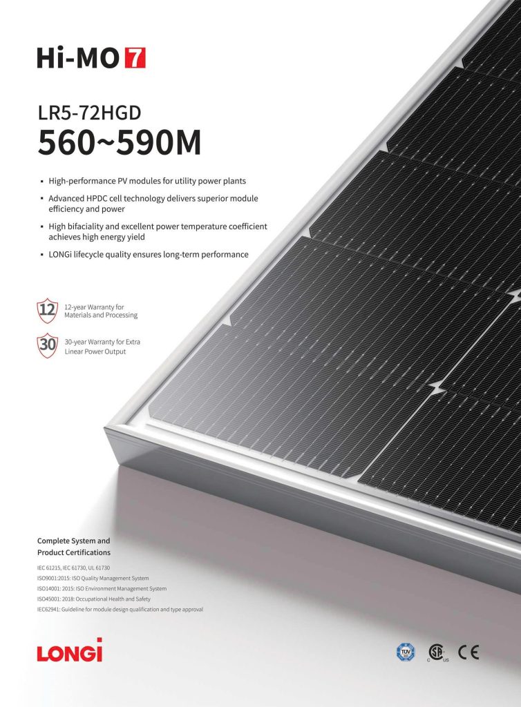 Tấm pin năng lượng mặt trời Longi LR5-72HTH Hi-MO7 là một sản phẩm tiên tiến và mới nhất hiện nay, với thiết kế 2 mặt kính vượt trội. Công suất từ 560W đến 590W, tấm pin này không chỉ mang lại hiệu suất cao mà còn đảm bảo độ bền và ổn định cho các hệ thống điện mặt trời.