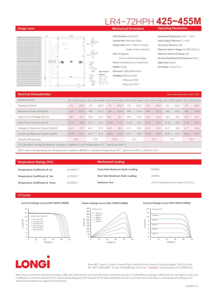 Thông số kỹ thuật của tấm pin năng lượng mặt trời LONGi 450W