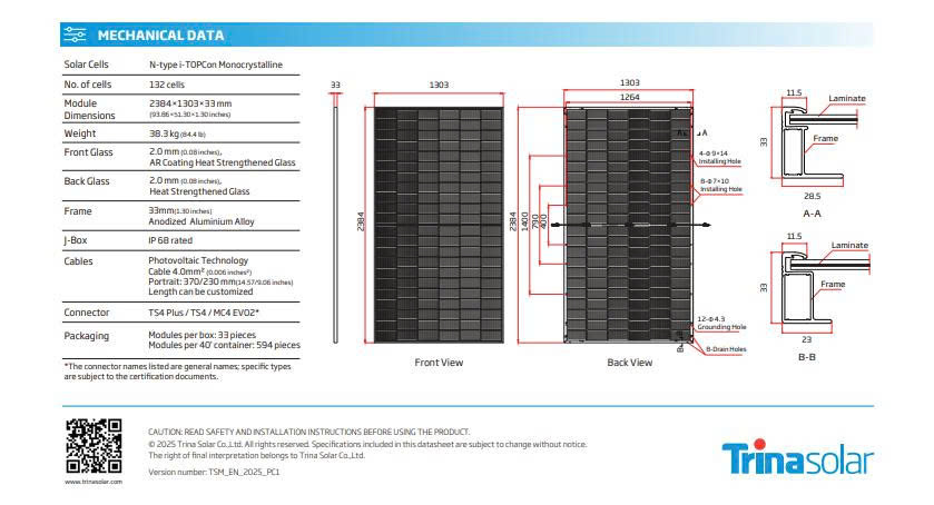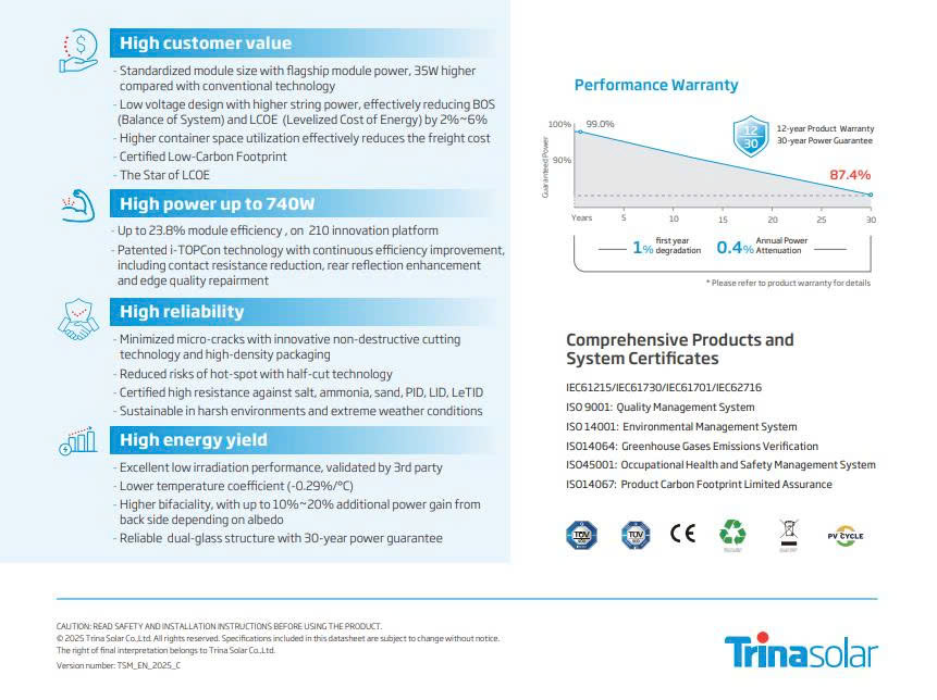 Trina Solar 740W – Vertex N là dòng pin công suất lớn thế hệ mới, ứng dụng công nghệ N-type i-TOPCon bifacial dual glass, mang lại hiệu suất vượt trội và độ bền lâu dài. Đây là giải pháp lý tưởng cho các dự án điện mặt trời quy mô lớn, tối ưu sản lượng điện và chi phí đầu tư.